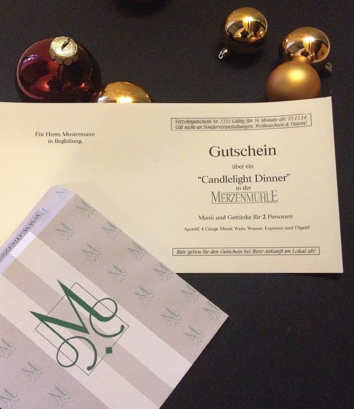 Zum Beispiel: - Beliebiger Betrag in beiden Lokalen einlösbar. - CANDLELIGHT DINNER in der MERZENMÜHLE |